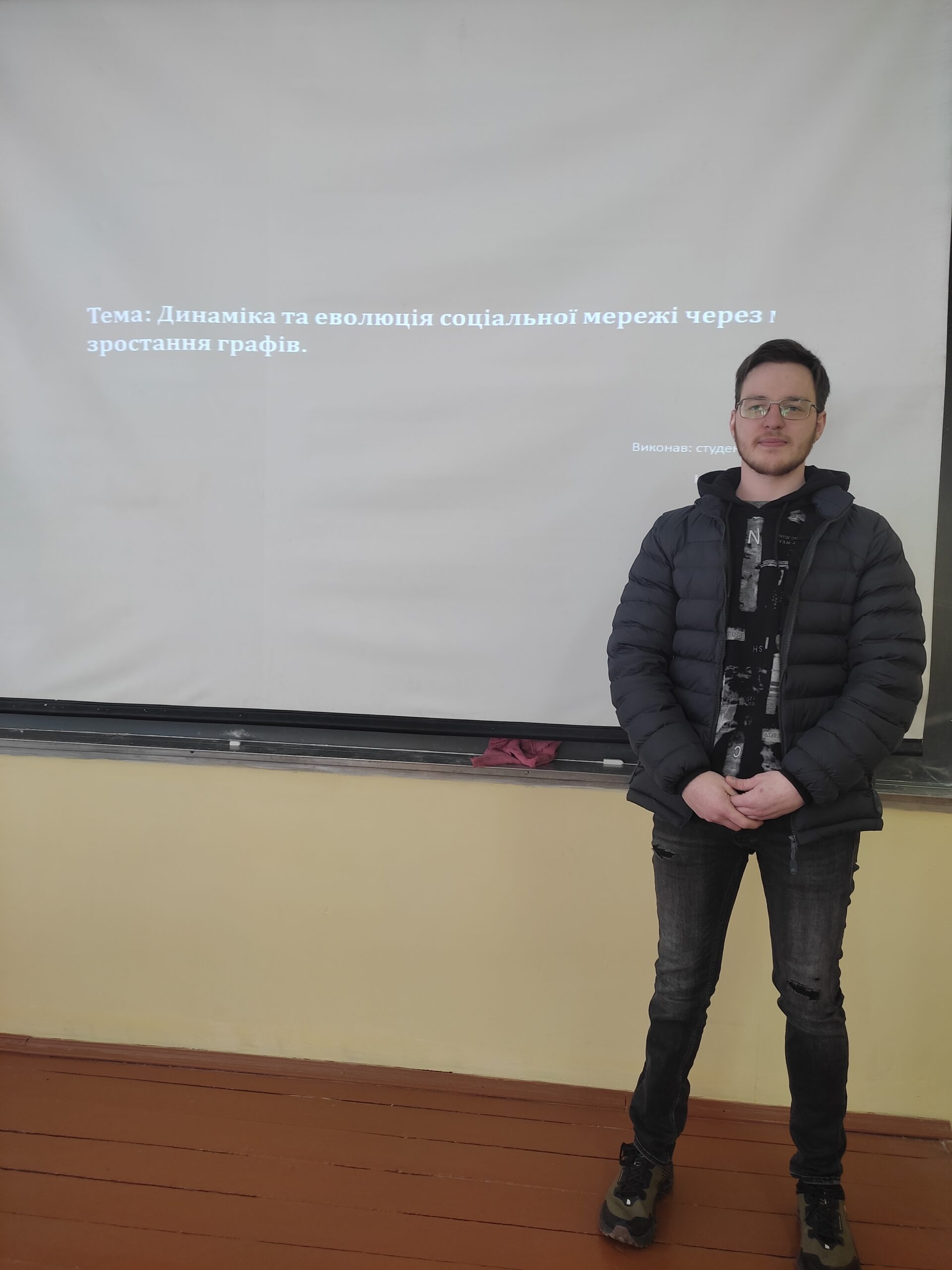 - Іван МУЗИКА (науковий керівник Тетяна ПИЛИПЮК) поділився результатами свого дослідження “Динаміка та еволюція соціальної мережі через моделі зростання графів”, для чого вивчав, як соціальні мережі формуються, розвиваються та змінюються з часом, використовуючи математичні моделі на основі теорії графів. Він аналізував різні моделі зростання графів та їхню здатність відтворювати реальні властивості соціальних мереж, такі як ефект “масштабної вільності” та “малого світу”. Доповідь була цікавою для тих, хто займається аналізом соціальних мереж, розробкою алгоритмів для рекомендаційних систем та розумінням процесів поширення інформації в онлайн-середовищі.