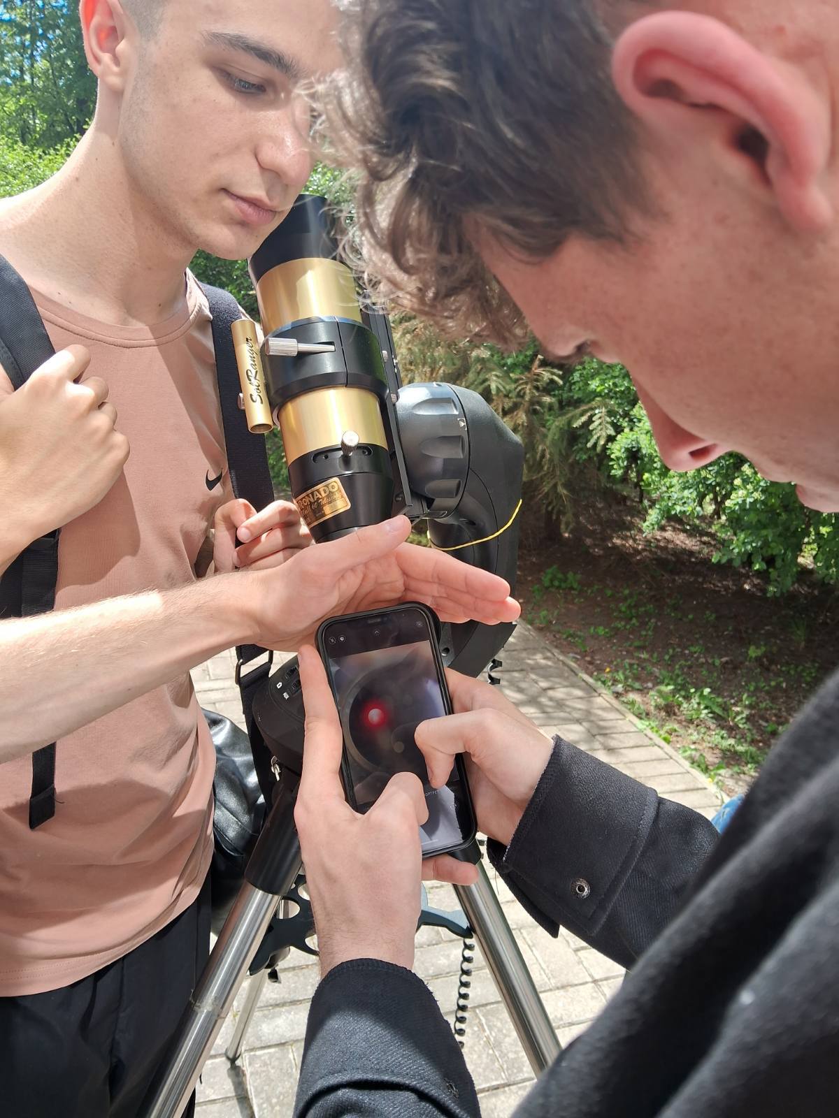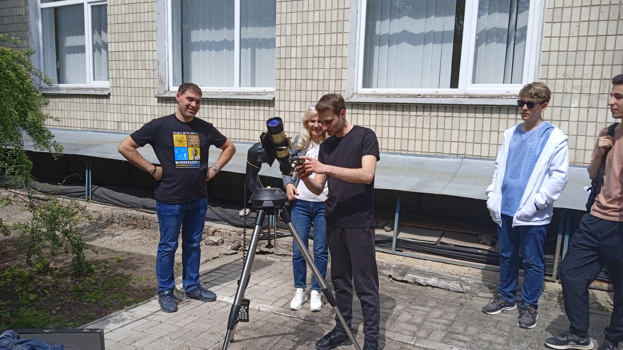 Напередодні Всесвітнього дня Астрономії (3 травня) здобувачі вищої освіти спеціальності 122  Комп’ютерні науки також долучилися до спостереження за активністю Сонця з використанням сонячного телескопа-геліографа. Молодший науковий співробітник Володимир Володимирович Василенко провів пізнавальну консультацію щодо особливостей будови телескопа-рефрактора та правил спостереження денного світила.