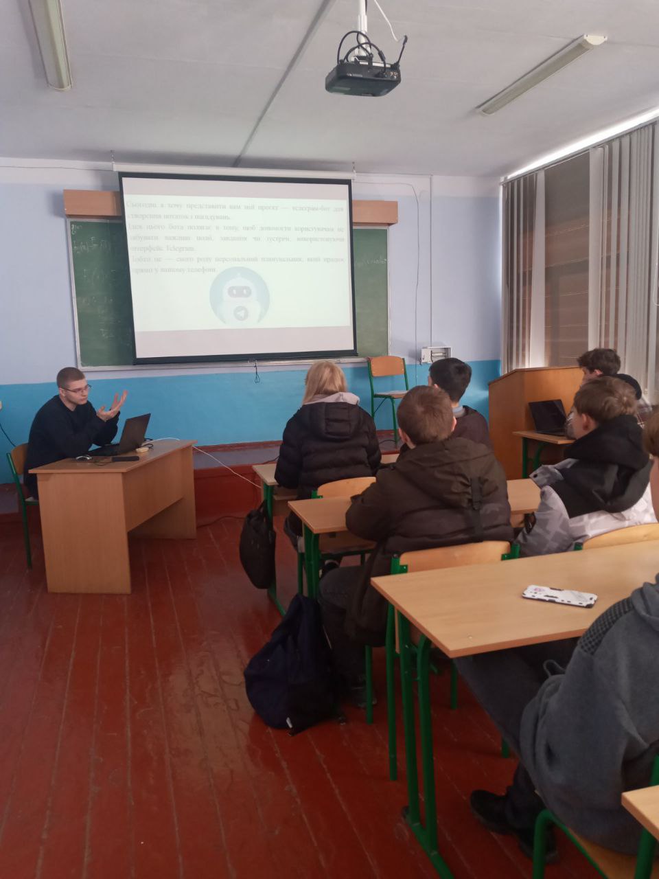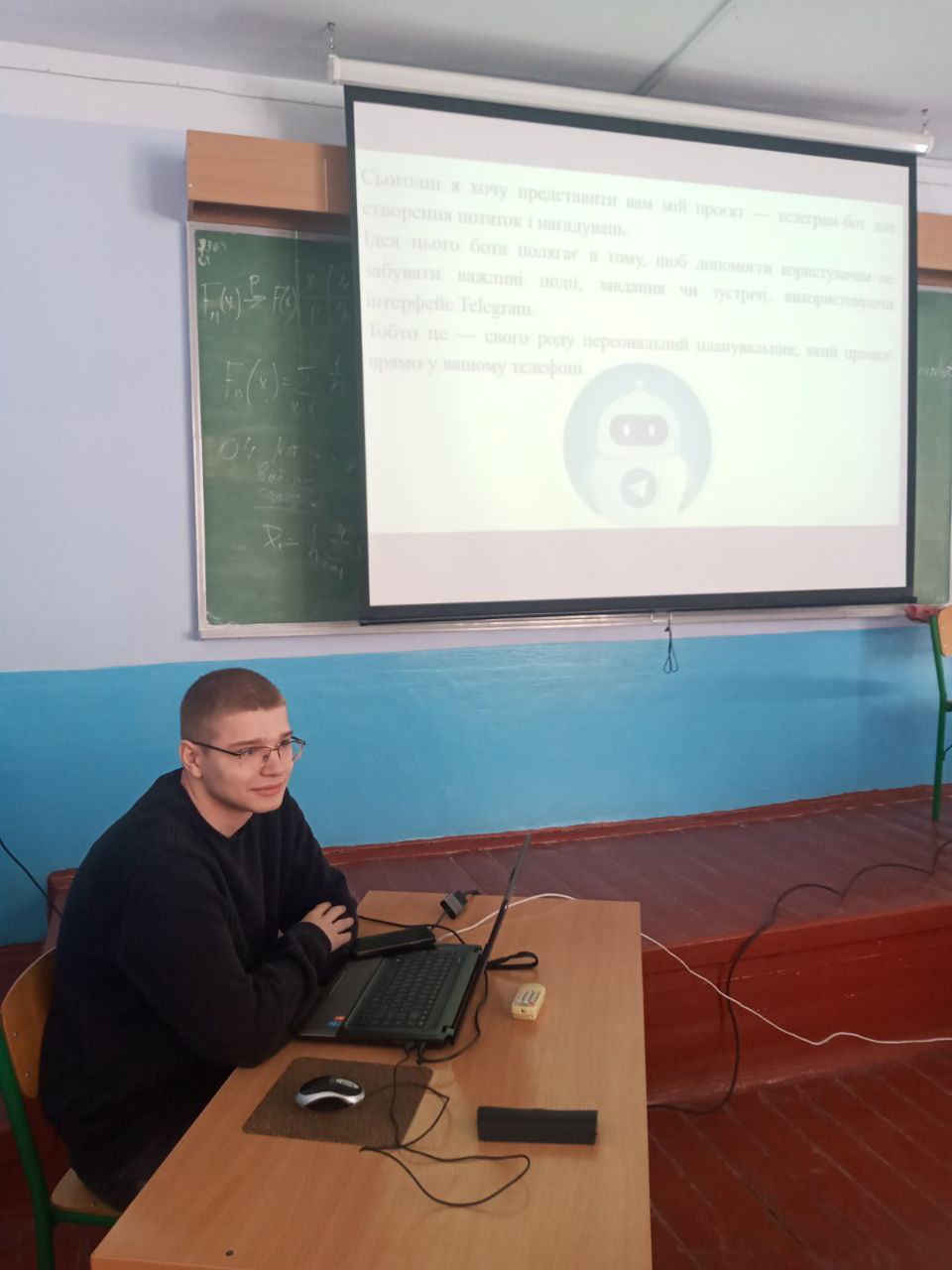 21 жовтня він презентував своє індивідуальне завдання, а саме проєкт “Створення чат-ботів засобами Python” іншим здобувачам вищої освіти. Функціонал чат-боту – створення нотаток і нагадувань. Усі присутні мали змогу власноруч здійснити тестування бота та оцінити його функціональні можливості.