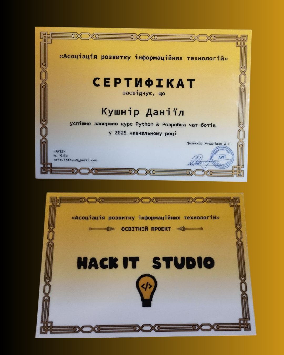 Здобувач вищої освіти 2 курсу спеціальності 122 Комп’ютерні науки Даніїл КУШНІР успішно завершив курс “Python & Розробка чат-ботів” від Асоціації розвитку інформаційних технологій у 2025 навчальному році в межах неформальної освіти.
