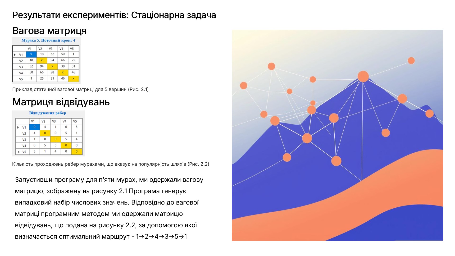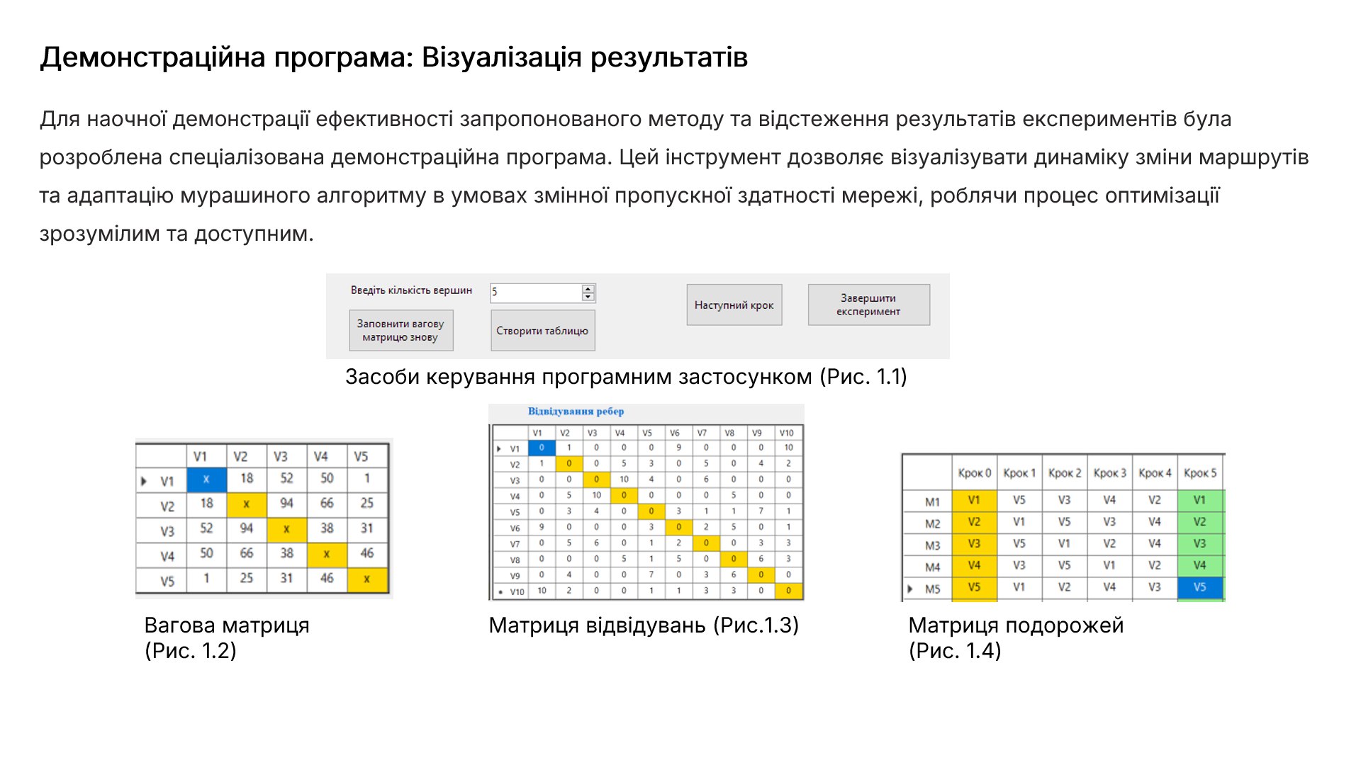 У роботі запропоновано метод оптимізації маршрутів на основі модифікованого мурашиного алгоритму, який враховує змінну пропускну здатність мережі. Проведено експериментальні дослідження, що підтвердили здатність алгоритму знаходити стабільні оптимальні маршрути навіть за постійних змін ваг ребер. Практичне значення роботи полягає у можливості застосування запропонованого методу в задачах транспортної логістики, мережевих систем та ІТ-інфраструктур.