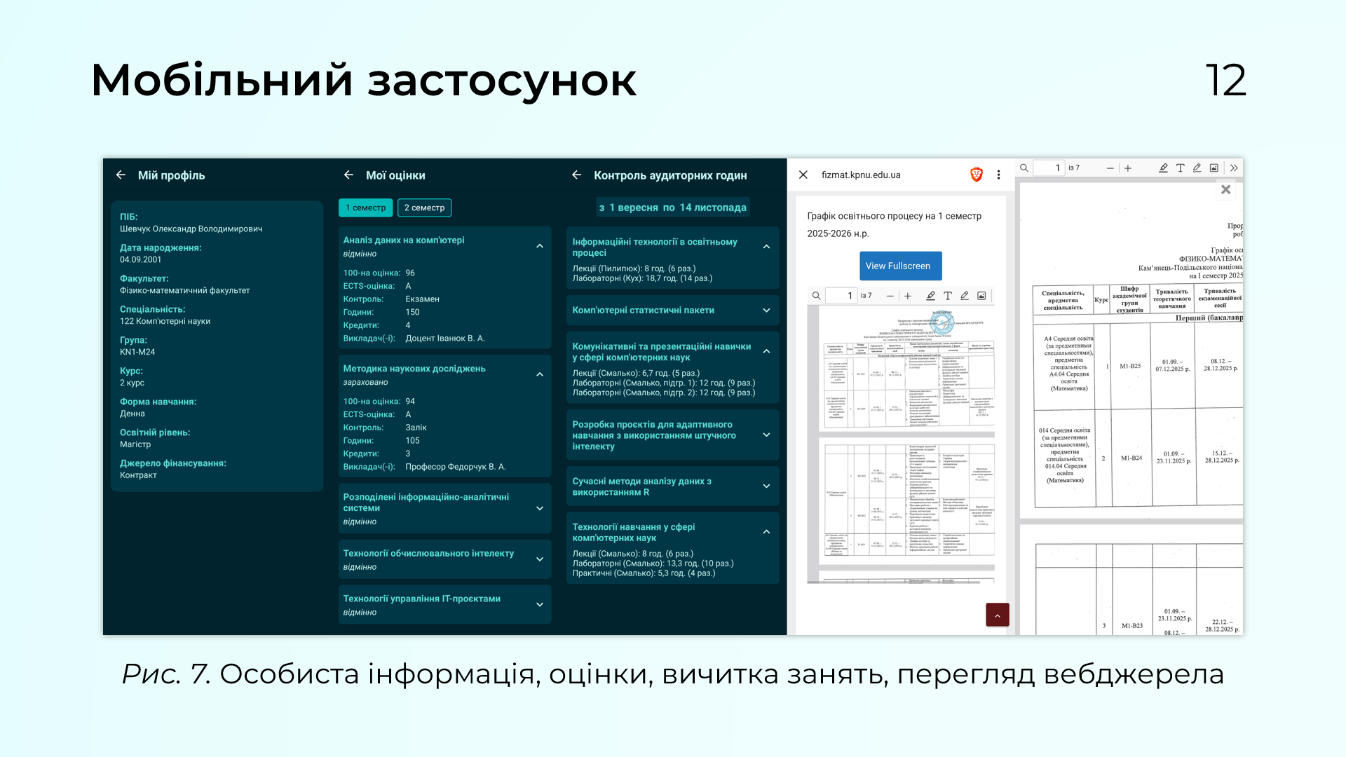 У роботі розроблено модель інформаційної системи, що включає мобільний застосунок для здобувачів вищої освіти, адміністративну панель для закладу освіти та серверну частину з бізнес-логікою і базою даних. Реалізовано інтеграцію з компонентами АСУ «ВНЗ» і вебресурсами закладу вищої освіти, що дозволяє мінімізувати ручне введення даних, уникнути їх дублювання та підвищити зручність доступу до актуальної інформації про освітній процес.