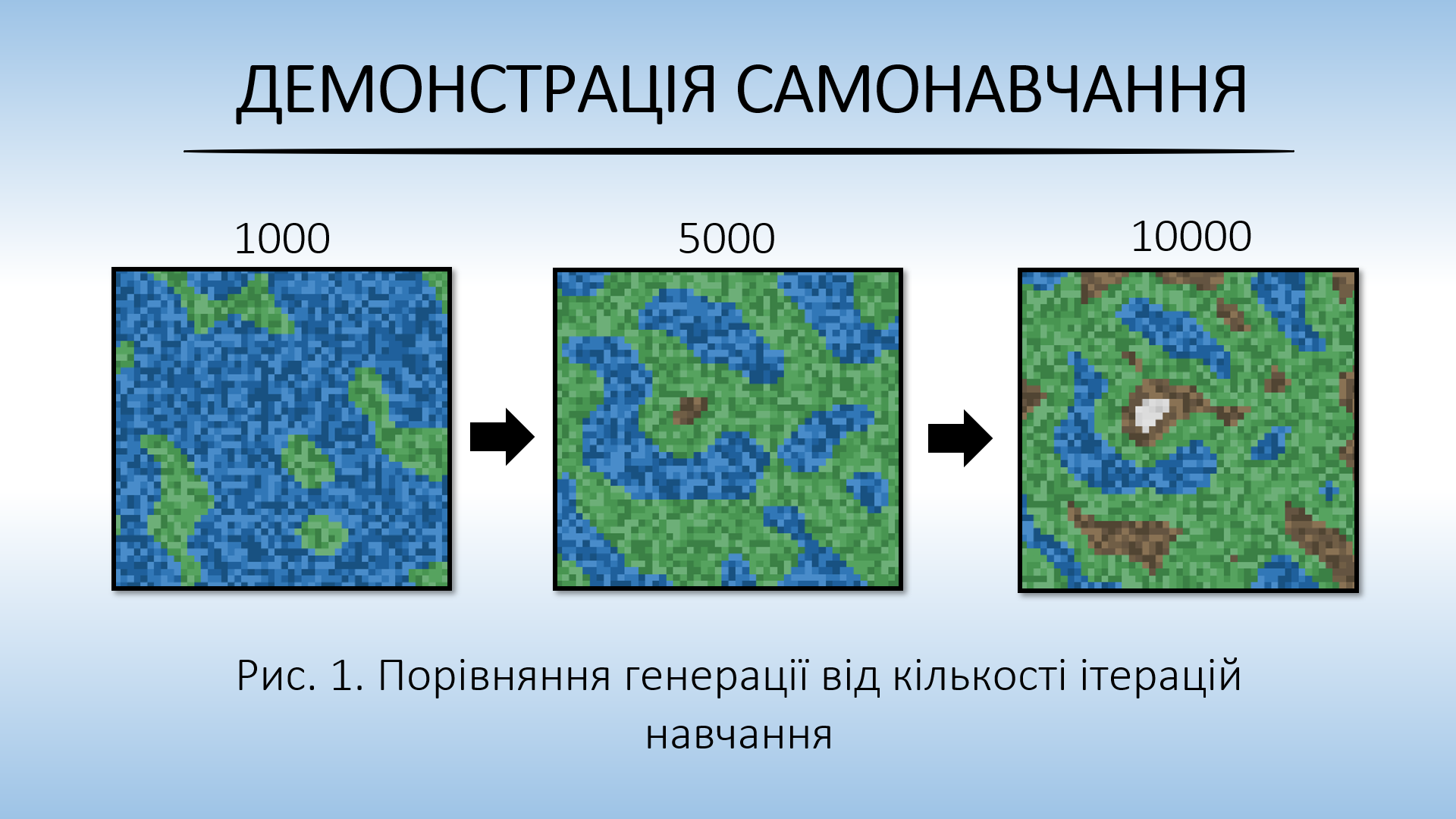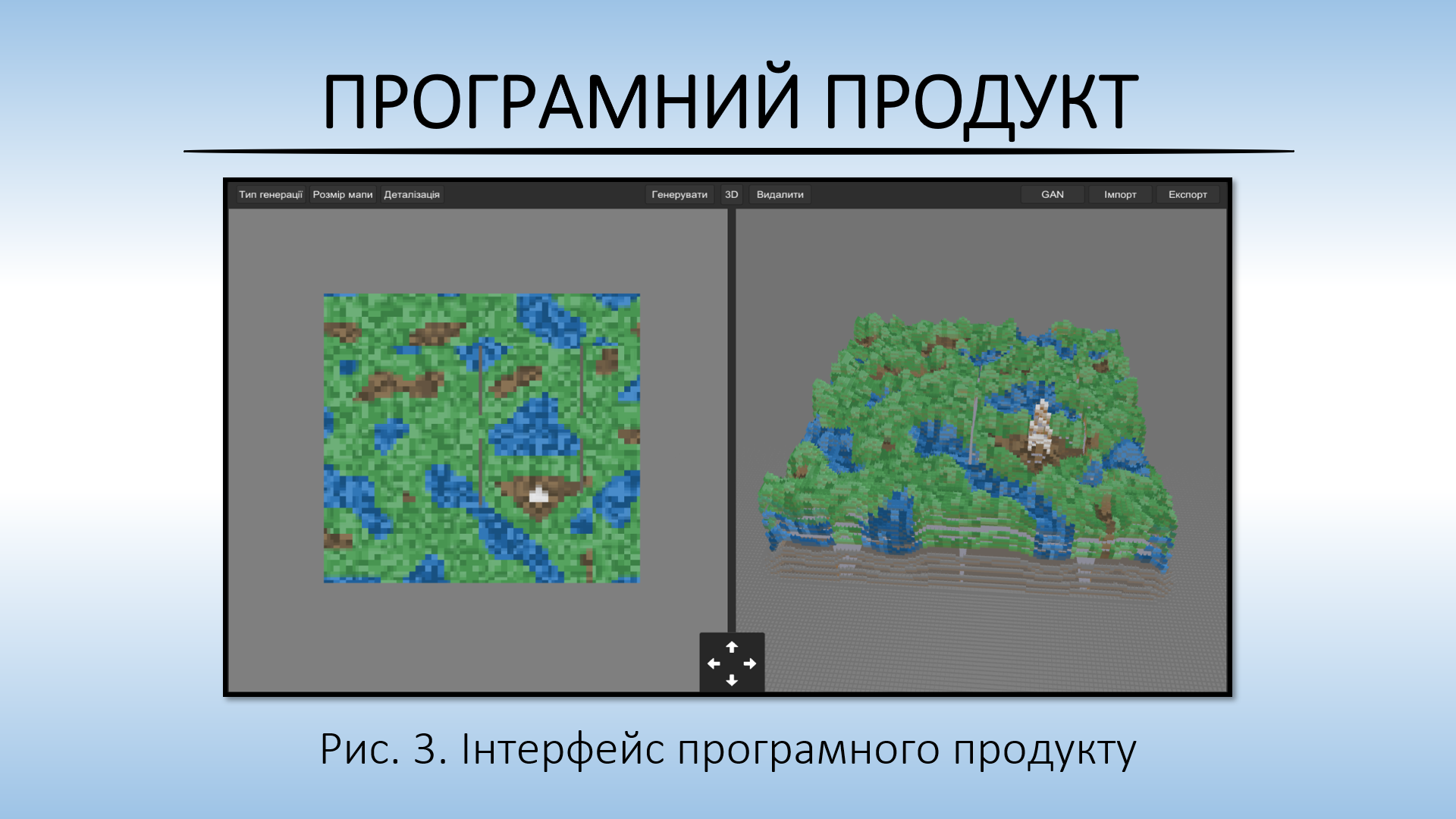 У межах кваліфікаційної роботи розроблено та досліджено алгоритми процедурної генерації на основі машинного навчання. Програмний продукт реалізовано в середовищі Unity із використанням інструментарію ML-Agents, що дозволило інтегрувати мови C# та Python (бібліотека TensorFlow). Розроблене рішення забезпечує генерацію 2D- та 3D-ігрових світів із можливістю гнучкого налаштування параметрів та аналізу якості отриманого контенту. Запропоновані підходи гарантують високу продуктивність, логічну цілісність та візуальну варіативність ігрових середовищ.