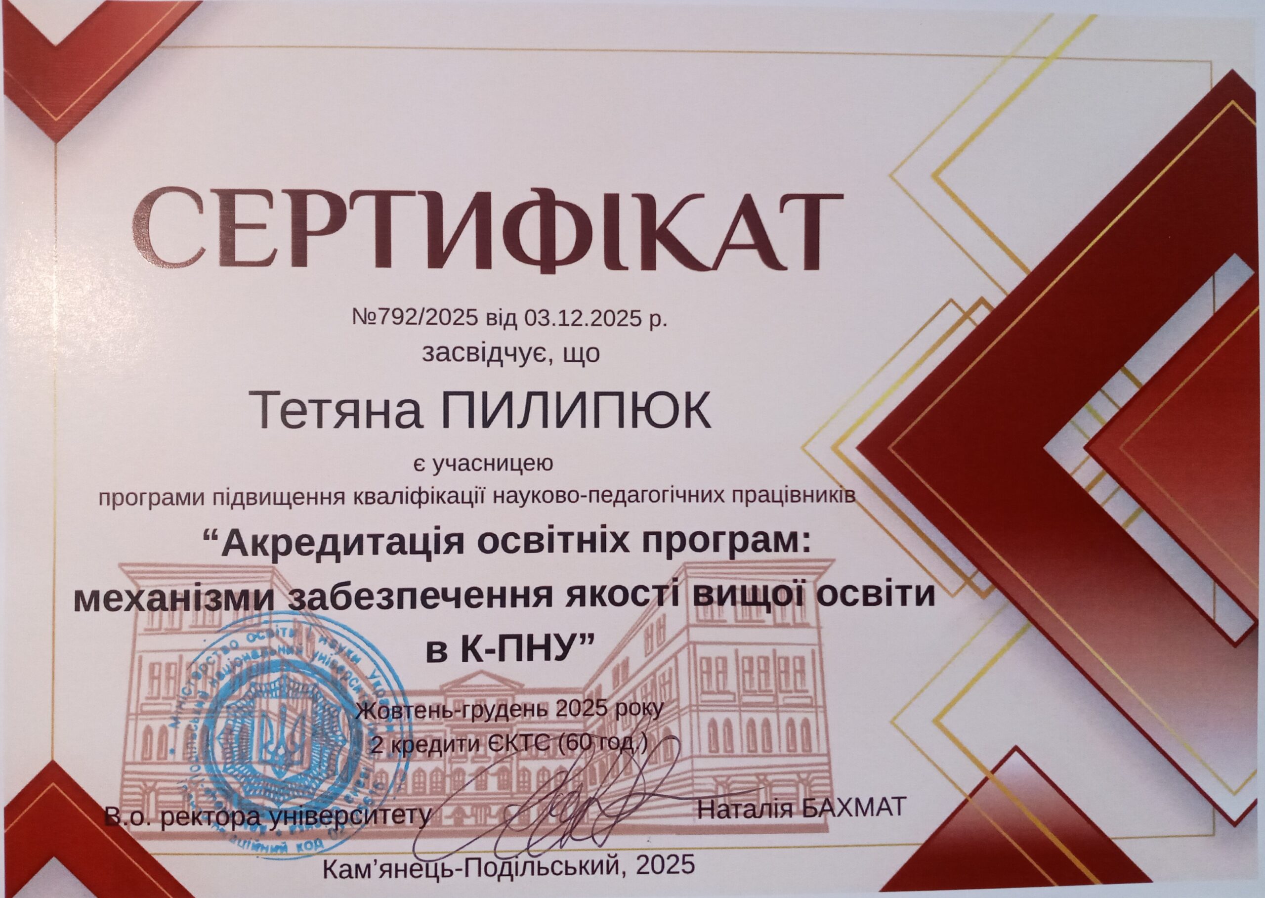 - Кам’янець-Подільський національний університет імені Івана Огієнка. Семінар “Процедура акредетації: від створення відомостей про самооцінювання до рішення Національного агентства”. Сертефікат №352/2025 від 28.10.2025 р.